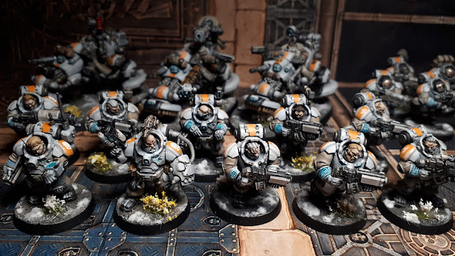 C'est ensuite pour le schéma que j'ai longtemps hésité. J'ai vite mis de côté le bleu que j'affectionne temps pour mes space wolves. Considéré un moment le vert des sons of horus mais trop terne au final. J'adore le rouge mais c'est un peu ma solution de repli, mon dernier recours. Je voulais peindre du orange depuis longtemps mais également partir sur un duo de couleur pour l'armure. Ce serait donc orange tranché blanc...ou pourquoi pas blanc tranché orange. En plus cette dernière solution m'obligerait à peindre du blanc avec les difficultés que cela pouvait entraîner. Mais pas grave on y va et tant qu'à faire j'enlève la solution de facilité de l'équation avec un éventuel recours au dernier lavis blanc sorti, le soulblight grey. Non ce sera pose de la base d'administratum Grey et premier éclaircissemnt au Corax White à l'aéro sur une sous-couche noire. Ensuite je passe un lavis dans les creux et je repasse un éclaircissement de blanc. Pour les socles vu que c'est l'hiver et qu'il me reste un beau pot de Valhallan Blizzard je ressort la recette des socles que j'ai utilisée pour ma Nightwatch.